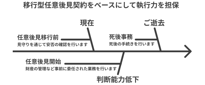 - 当社のサービスでは、お客様の現在の安心と将来の安心を両立させるため、「移行型任意後見契約」を提携士業と締結していただきます。
