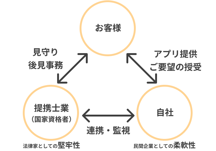 - 当社の役割:当社は、民間企業の強みを活かし、多様なお客様へのサービス展開と柔軟性を持ってお客様に対応いたします。お客様へのサービスの窓口として、システムの提供(見守りアプリ等)、提携士業との連携および業務のマネジメントを行います。お客様のもしもの際にも、提携士業と連携し、スムーズなサービス提供をバックアップします。当社と提携士業で実行と管理を分離してリスク分散をします。
